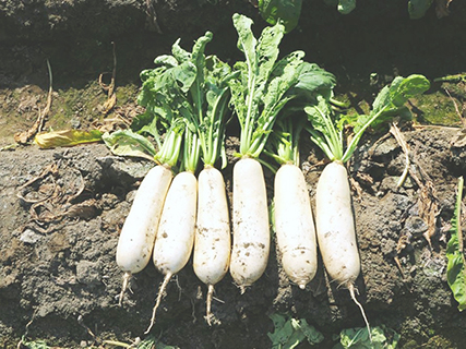 白蘿蔔,形體細長,外表嫩滑,甘脆多汁,潤喉清嗓,清熱生津,為十字花科植物萊菔的鮮根,含水量可高達百分之九十五,維生素C含量高達十九毫克每百克,能提高免疫力,延緩衰老,阻止色斑的形成,保持皮膚水潤白嫩。白蘿蔔還含有澱粉酶、氧化酶等酶類,能促進食物中的澱粉、脂肪分解並吸收,有助於消化。白蘿蔔的芥子油能促進胃腸蠕動,既助消化又能開胃,還能加快澱粉和糖類的分解,減少體內脂肪的堆積。