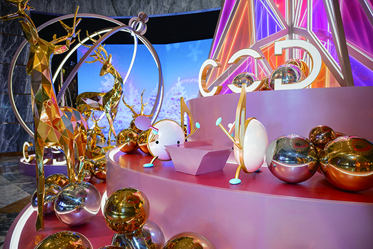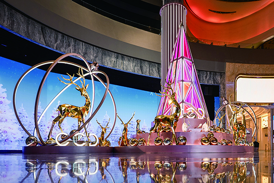 新濠天地室內空間,節日裝飾及巧思遍佈度假村內多個空間。位於度假村主入口,15米寬的巨型聖誕裝置驚喜亮相——高達9米的未來感粉金色聖誕樹與金色的馴鹿相伴而立;「動感音符小精靈」穿梭其間,吸引賓客打卡留影。