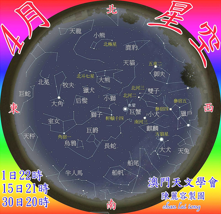 水星西大距時間為4月4日6點。(亮度 0.2等,距角27.8°)。木星東方照時間為4月6日6點。(亮度-2.2等,視直徑38.3")。海王星合火星(南0.35°)時間為4月13日18點。海王星合水星(北1.43°)時間為4月17日零點。火星合水星時間為4月20日8點(北1.81°)。水星合土星時間為4月20日16點(南 0.50°)。天王星合金星4月24日13點(南0.78°)。金星接近昴宿星團時間為4月24日(相距約3.5°)。◇(建燁)