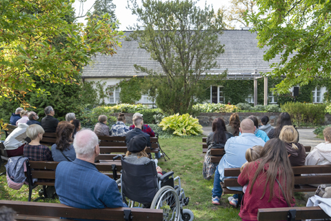 ◎ 九月二十七日,在波蘭熱拉佐瓦沃拉的蕭邦出生地博物館,遊客在戶外聆聽室內演奏的鋼琴曲。