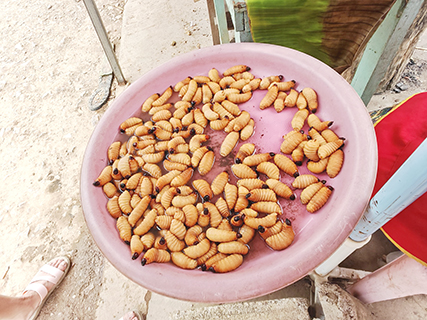 湖邊園門兩旁,沙地上是熱鬧的攤販市集,果汁攤檔遊人擁擠,花上老撾基普五萬(約合澳門幣十八元),便能品嘗一杯新鮮現榨的牛油果汁,清甜爽口,滿是自然滋味。小食攤上售賣着當地特色山珍:棕櫚蟲、烤鼠、蝙蝠等野味,風味獨特,不過也讓部分人望而卻步。